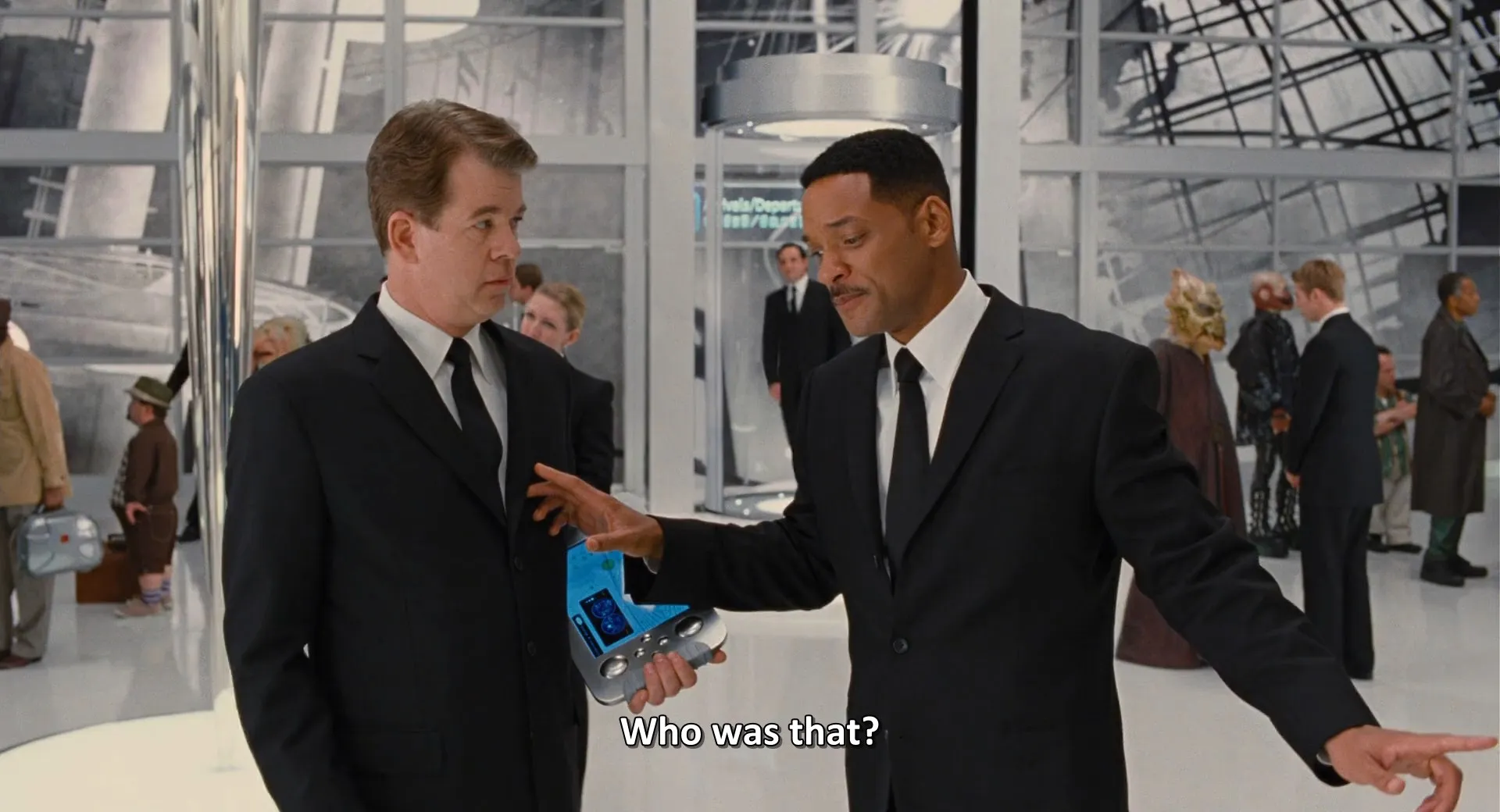 Cast: Will Smith as Agent J, Tommy Lee Jones as Agent K, Josh Brolin as Young Agent K, Jemaine Clement as Boris The Animal, Emma Thompson as Agent O, Michael Stuhlbarg as Griffin, Mike Colter as Colonel, Nicole Scherzinger as Boris's Girlfriend, Michael Chernus as Jeffrey Price, Alice Eve as Young Agent O, David Rasche as Agent X, Keone Young as Mr. Wu, Bill Hader as Andy Warhol, Cayen Martin as Colonel's Son, Clarke Thorell as Prison Guard #1, Adam Mucci as Prison Guard #2, Tom McComas as Prison Guard #3, Douglas Crosby as Prison Guard #4, Woodie King Jr. as 2012 MIB HQ Guard, Jack O'Connell as 1969 MIB HQ Guard, Tobias Segal as 1969 MIB Agent #1, Jon Shaver as 1969 MIB Agent #2, Gerritt Vandermeer as 1969 MIB Agent #3, Alexandra O'Hara as Mom, Violet O'Hara as Little Chocolate Milk Girl, Valence Thomas as Coney Island Hippie, Chloe Sonnenfeld as Coney Island Flower Child, Lanny Flaherty as Obadiah Price, Jonathan O'Hara as MIB Desk Agent, Rick Baker as Brain Alien, Joseph D'Onofrio as New York Mets Fan #1, Joseph R. Gannascoli as New York Mets Fan #2, Katy Frame as Diner Waitress, Kevin Townley as Funky 60's Dude, Stephen Brian Jones as Guru, Tyler Johnson as Muscle Boy at Happening, Kati Rediger as Muscle Boy's Girlfriend at Happening, Victor Joel Ortiz as Air Force MP #1, Charlie Barnett as Air Force MP #2, Ian Blackman as Car Theft Victim, Jeremy Beiler as Hotel Doorman, Liliane Klein as Screaming Lady on Ferris Wheel, Britt Chandler Johnson as Detained Teenage Alien, Jared Johnston as Neil Armstrong, Ken Arnold as Buzz Aldrin, Jonathan Drew as Michael Collins, Joel Brady as 1969 Man in Elevator, David Pittu as Roman The Fabulist, Lenny Venito as Bowling Ball Head, Anthony J. Gallo as Four-Armed Alien, James Martin Kelly as 1969 NYPD Cop #1, Will McLaughlin as 1969 NYPD Cop #2, Kimmy Suzuki as Mr. Wu's Bartender, Kirk Larsen as Dead Zed, Rebecca Glasscock as Transvestite at Happening, Barry Sonnenfeld as Husband Watching Launch, Susan Ringo as Wife Watching Launch, Stephanie Ellis as Young Wife #1 Watching Launch, Ben Mac Brown as Young Husband #1 Watching Launch, Amy Erwitt as Young Wife #2 Watching Launch, Brad Abrell as Worm (voice), Tim Blaney as Worm (voice), Thom Fountain as Worm (voice), Carl J. Johnson as Worm (voice), Will Arnett as Agent AA (uncredited), Jada Pinkett Smith as Party Guest (uncredited), Tony Shalhoub as 1969 Newsstand Vendor (uncredited), Alex Ziwak as Prisoner (uncredited), Jason Liles as Feelers / Colussus (uncredited), Jesse Ridgway as Pedestrian (uncredited), Justin Bieber as Alien on TV Monitors (uncredited), Erin Lindsey Krom as Headquarters Secretary, Tim Burton as Alien on TV Monitors (uncredited), Eha Urbsalu as 1969 MIB Secretary #1 (uncredited)